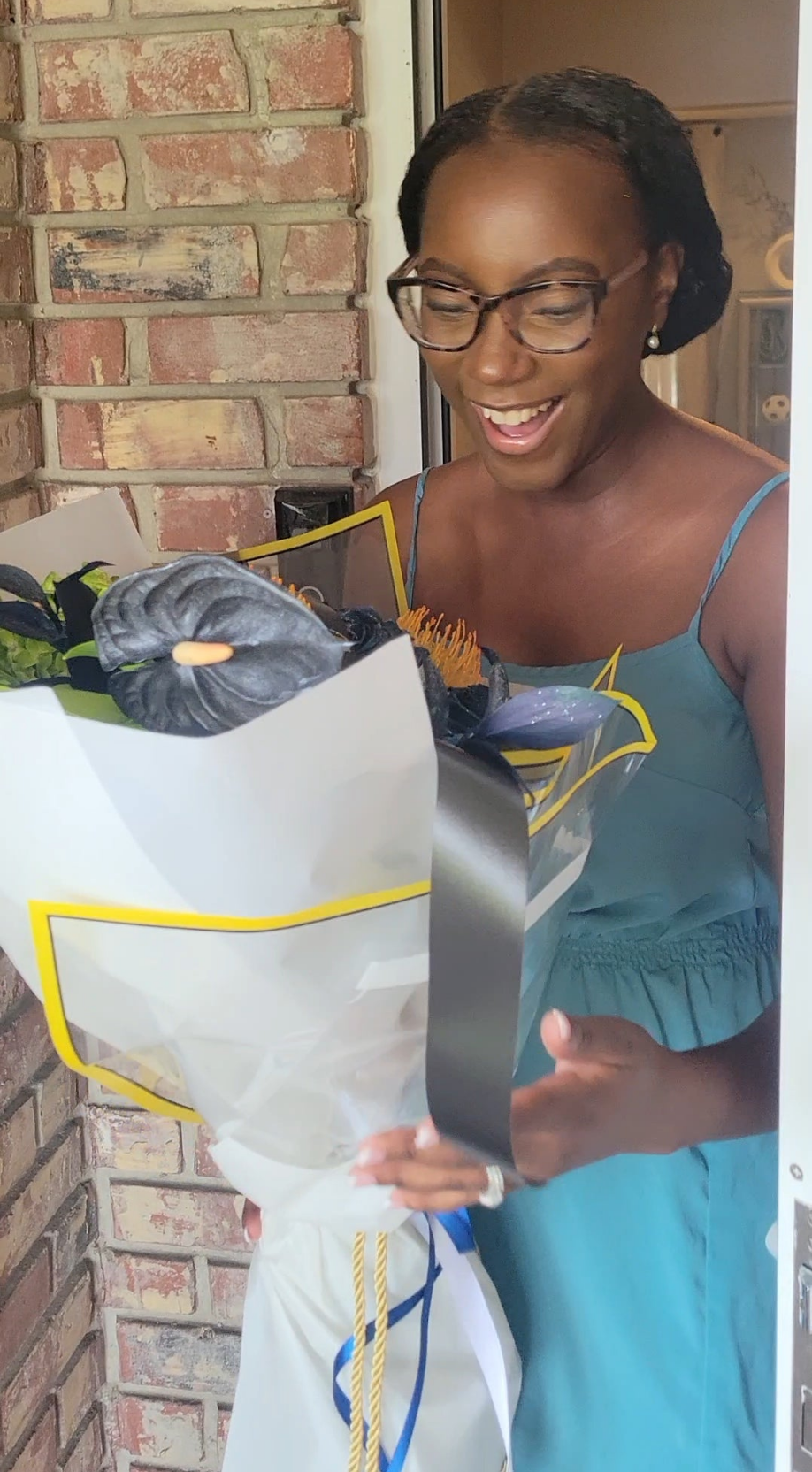 The bouquet is further enhanced with white and blue hydrangeas, providing a soft and delicate contrast. To complete the arrangement, cheerful yellow poms are interspersed, adding a pop of sunshine and warmth. A delightful way to brighten someone’s day or add a touch of beauty to your home.