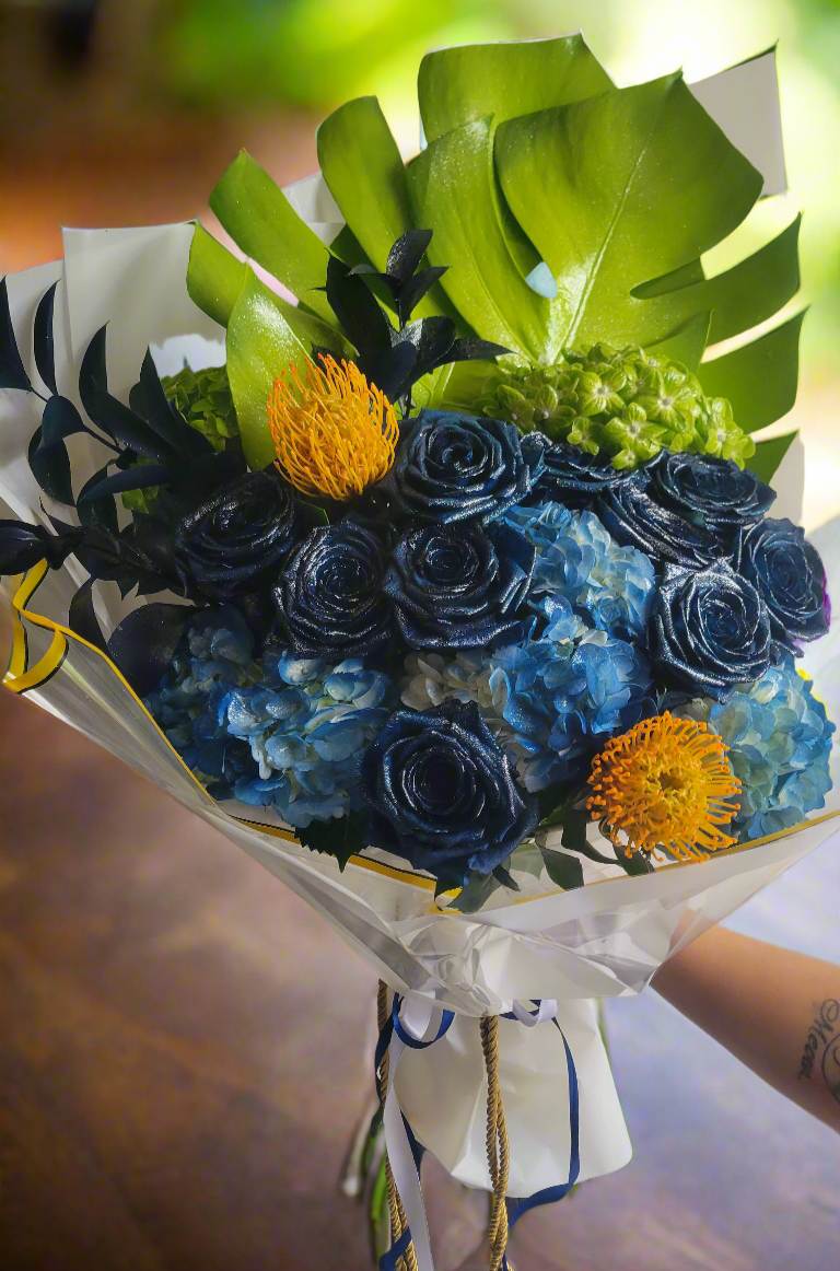 This unique bouquet features two shades of blue, creating a beautiful gradient of color. Complementing the roses are lush green leaves, adding a touch of natural elegance.