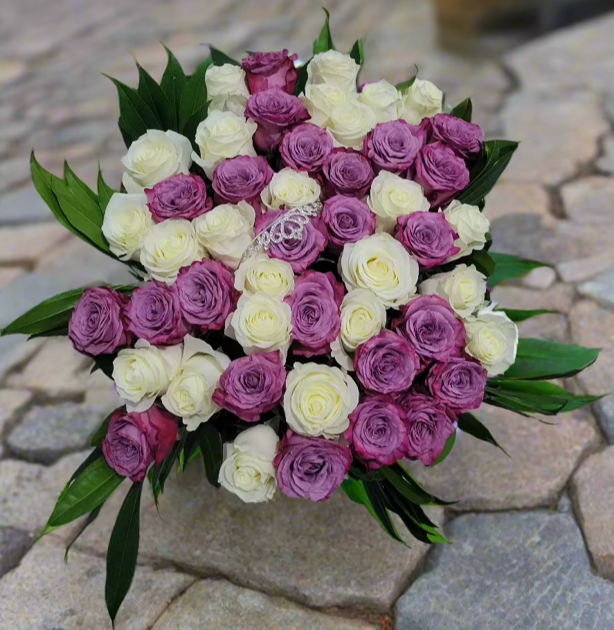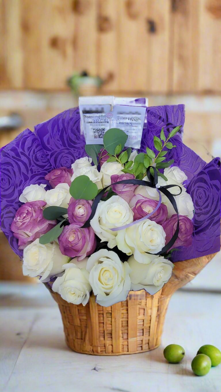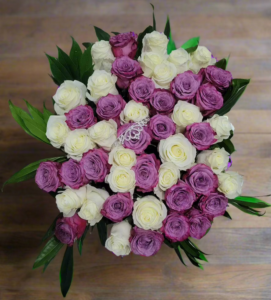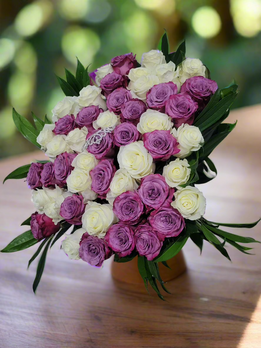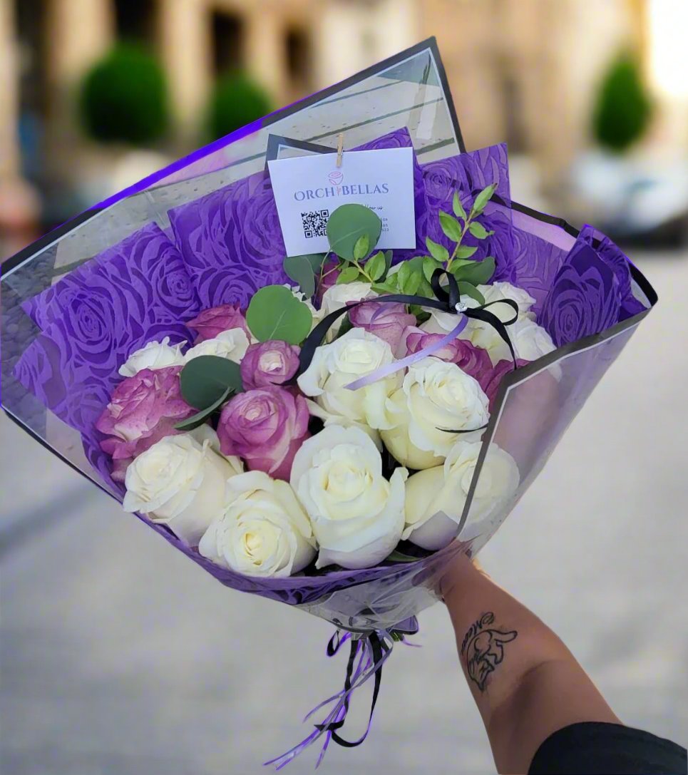 Engulf yourself in the serene regality of our Moonlit Majesty Bouquet. A combination of colors like no other. The white roses, with their delicate petals and subtle fragrance, represent new beginnings and everlasting love. Complementing them, the purple roses add a touch of mystery and majesty, making this bouquet a truly captivating gift.
