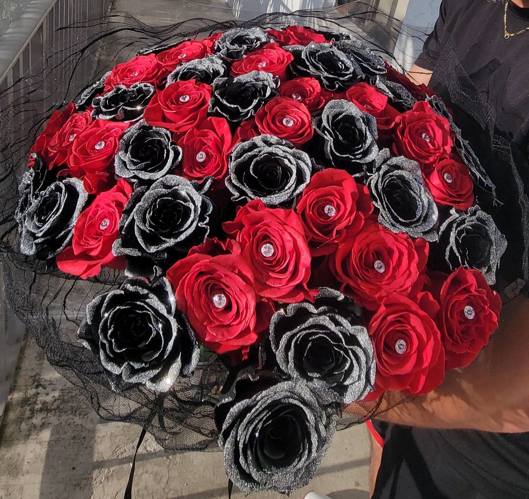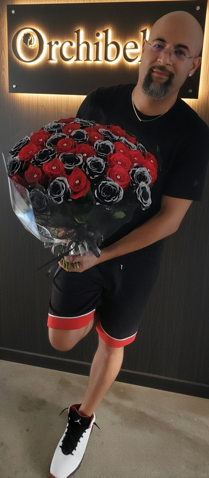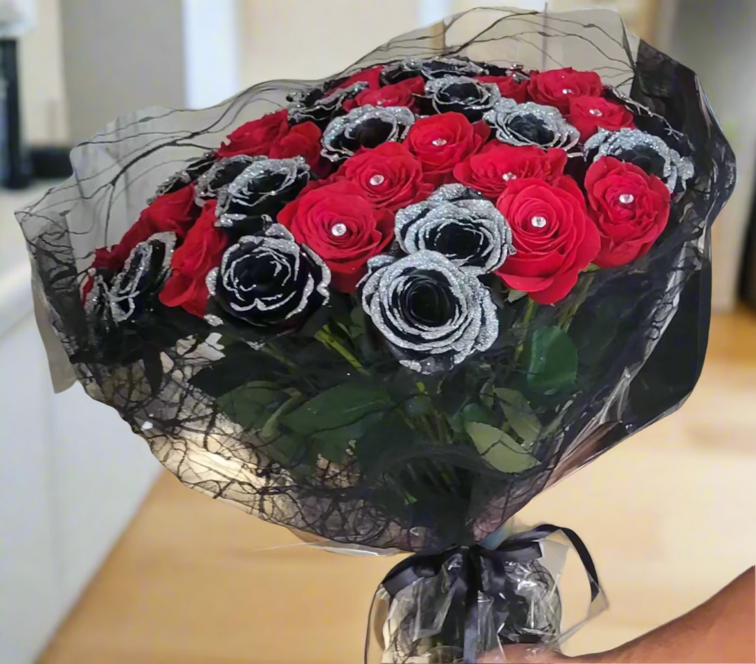 Experience the captivating allure of our Crimson Shadows bouquet. This striking arrangement features a dramatic blend of passionate red and mysterious black roses, creating a powerful visual contrast that symbolizes both love and intrigue. Let the Crimson Shadows bouquet be a reminder of the intensity and depth of your feelings.