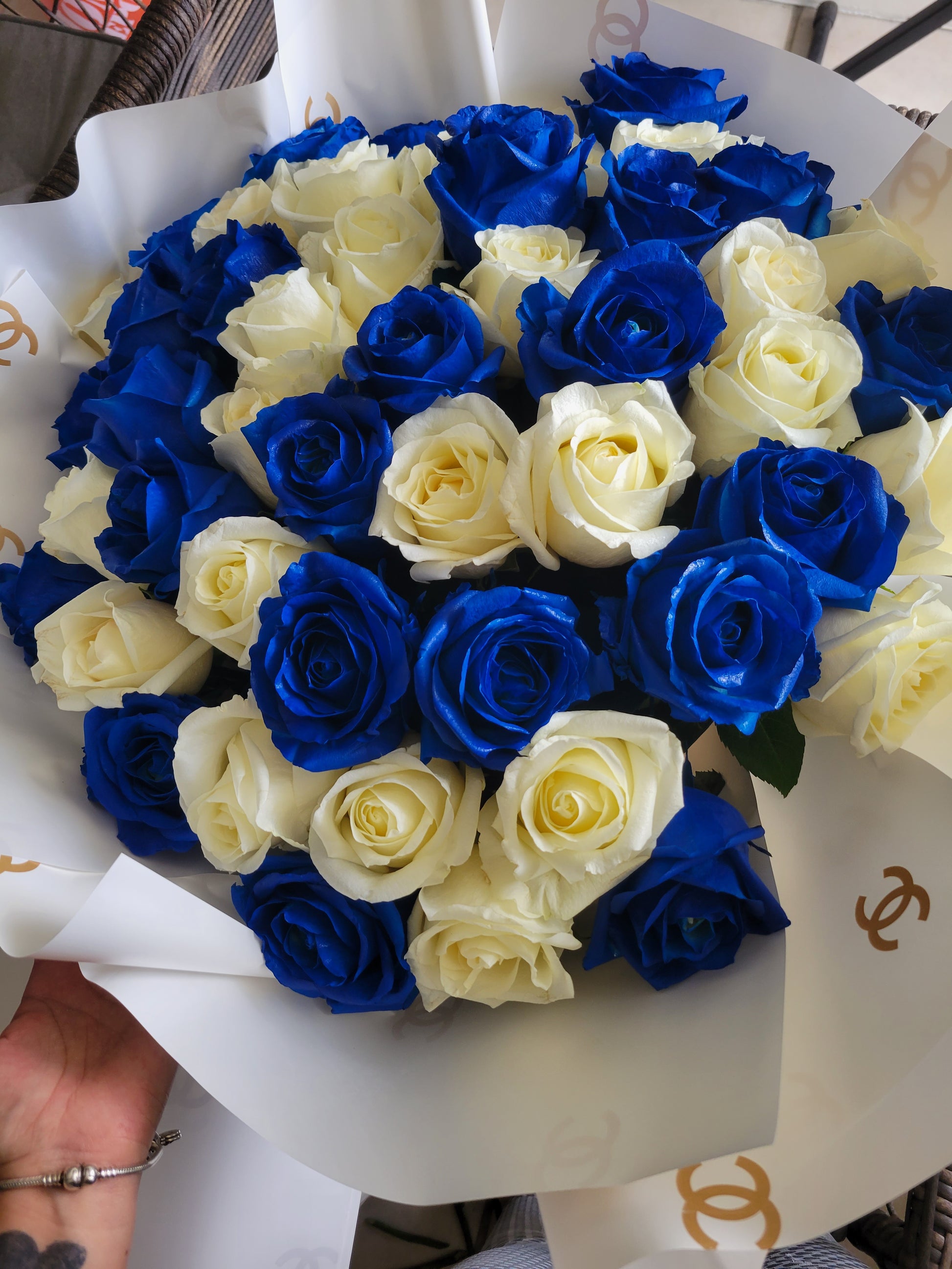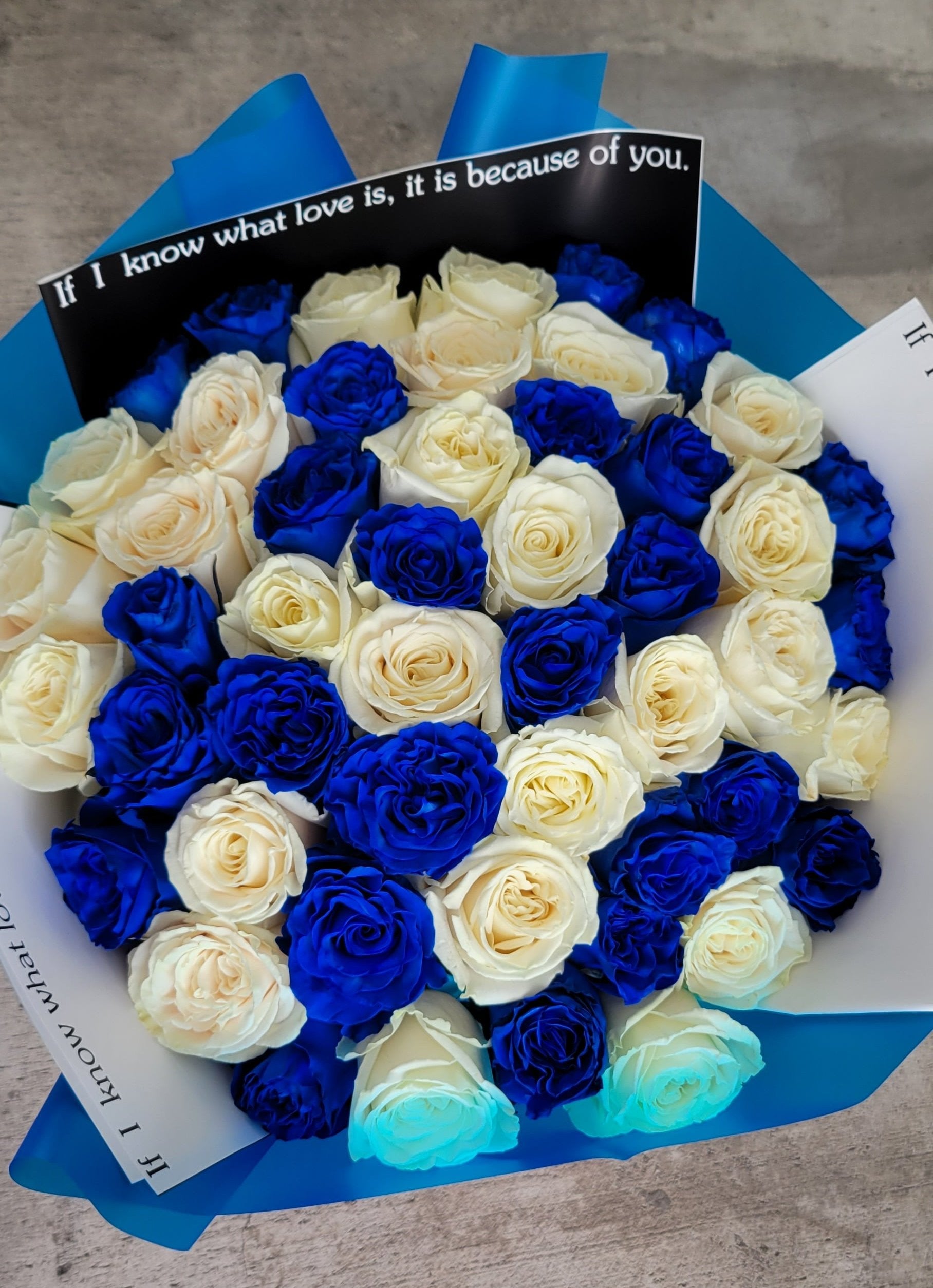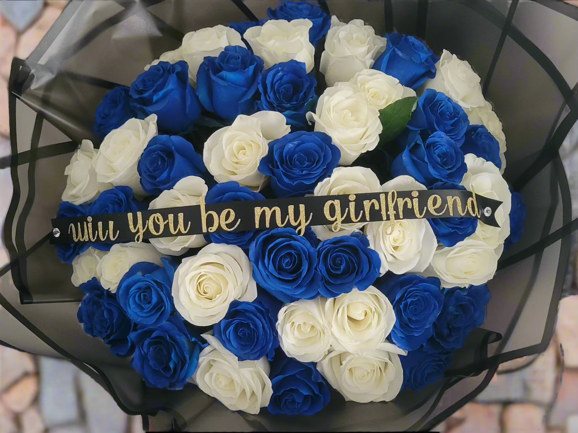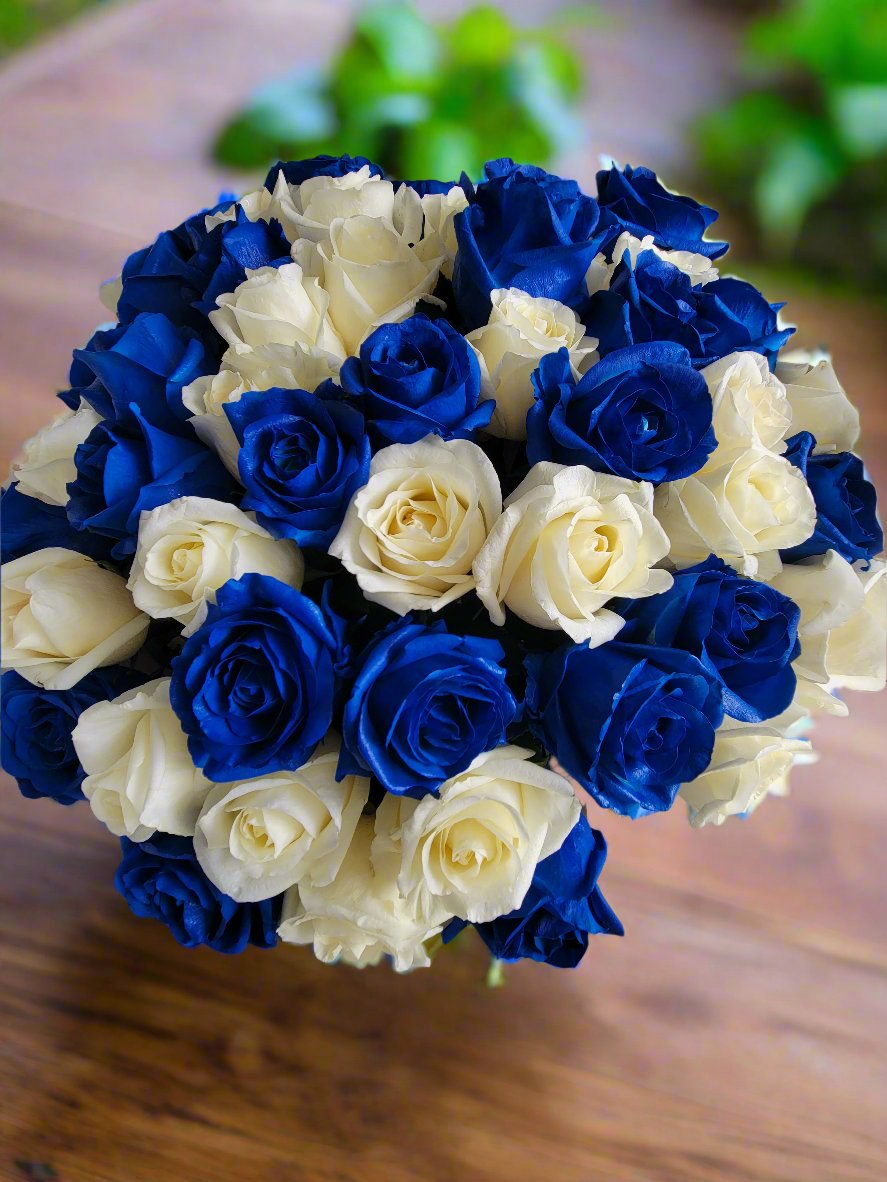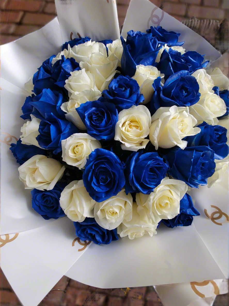 The blue roses, with their enchanting hue, symbolize mystery, the unattainable, and the extraordinary. They evoke a sense of calm and serenity, making this bouquet a perfect gift for someone who brings tranquility into your life. Complementing them, the white roses represent purity, new beginnings, and everlasting love, adding a touch of grace and simplicity to the arrangement.
